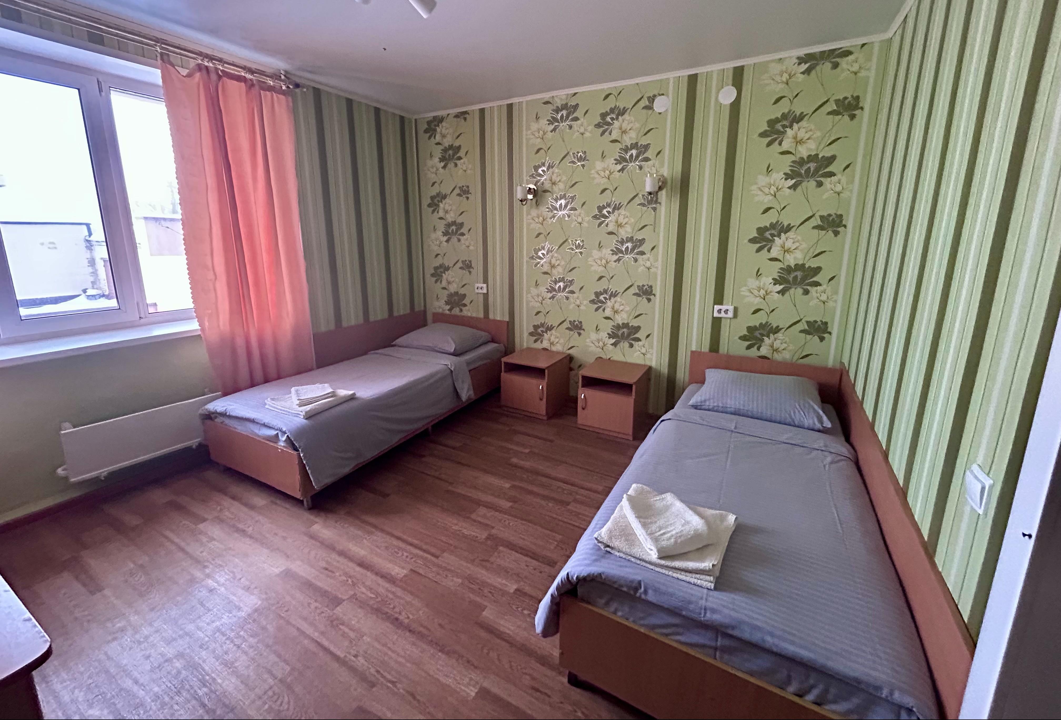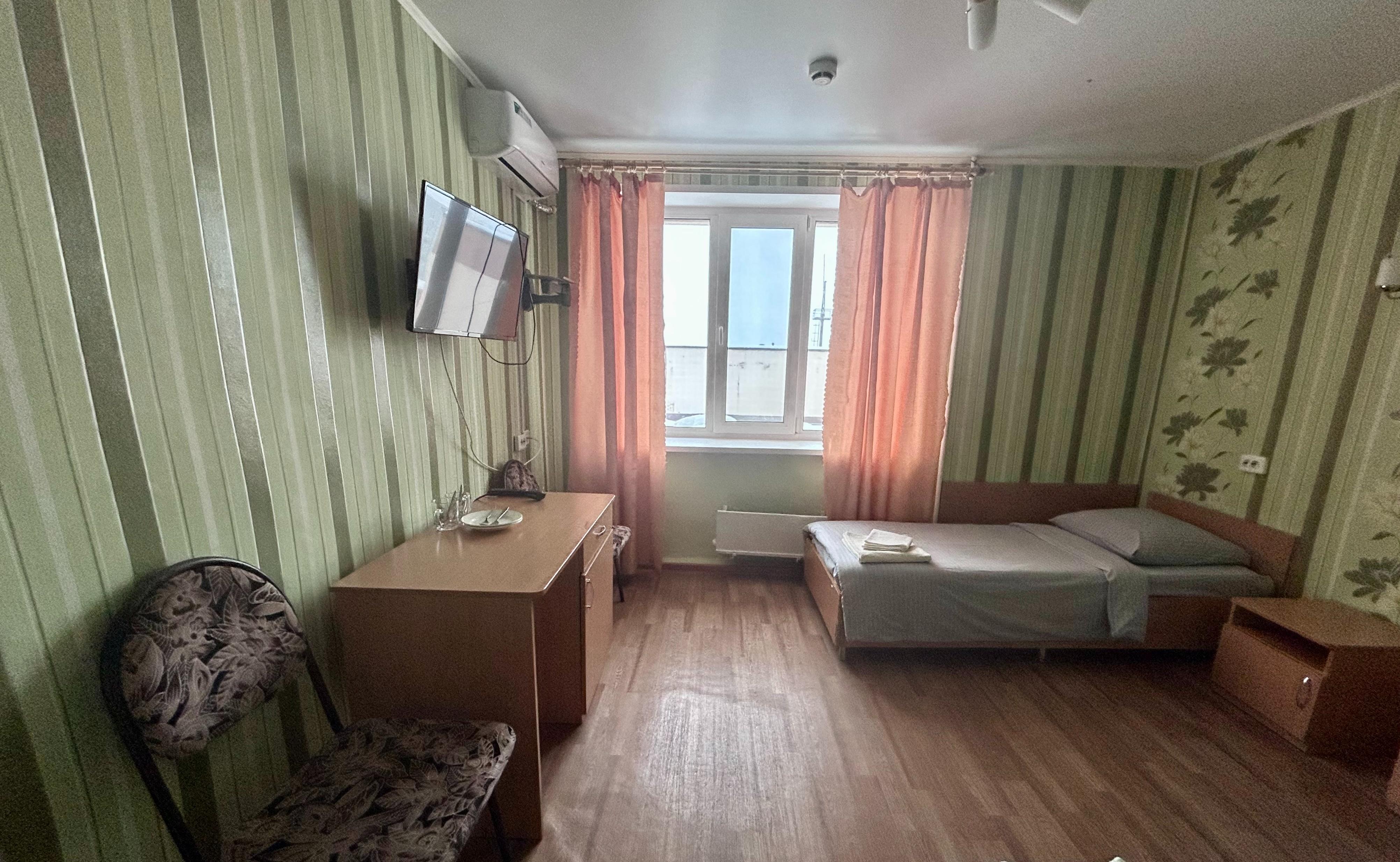 В оснащение номера входит: две односпальные кровать, письменный стол, стулья, холодильник, телевизор.