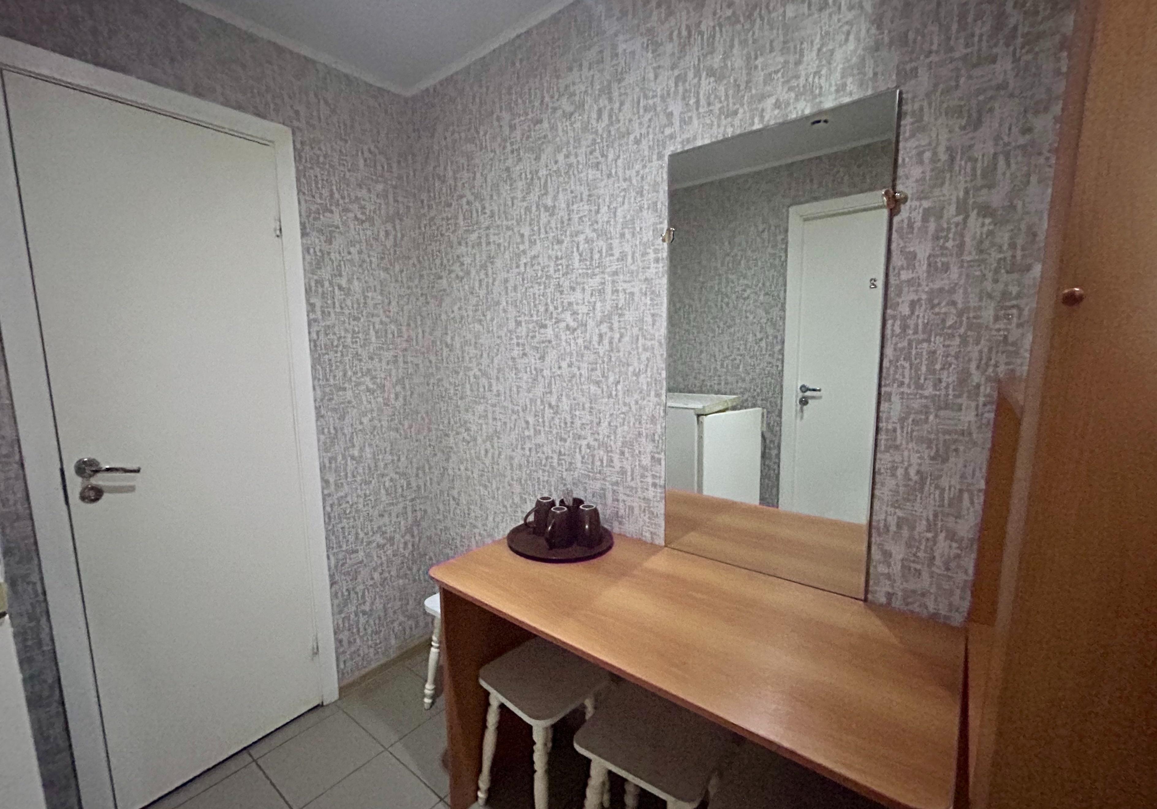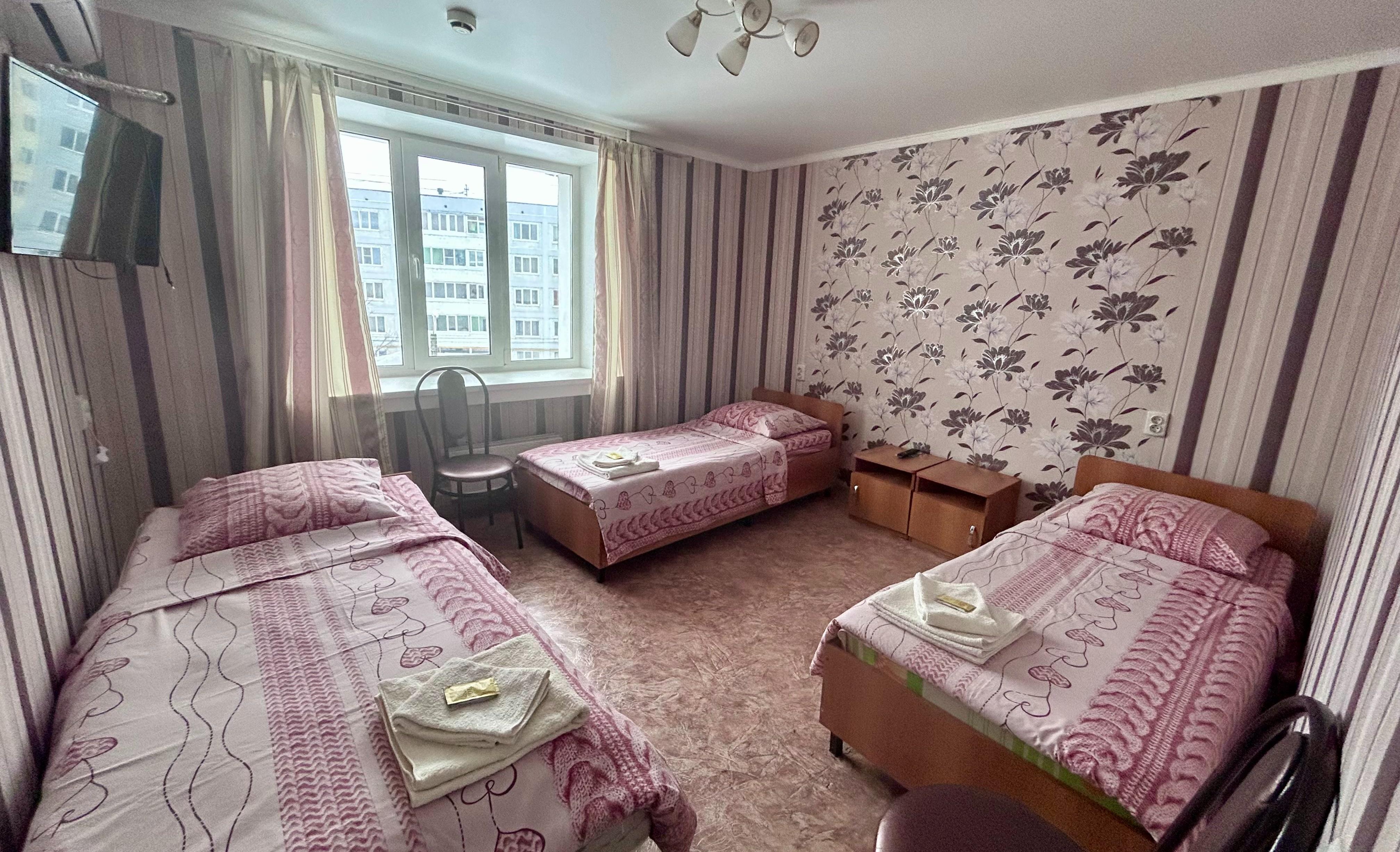 В оснащение номера входит: две комнаты, в каждой из которых: три односпальные кровати, прикроватные тумбочки, стулья, телевизор.